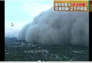 アメリカ・アリゾナ州最大の都市フェニックスを巨大な砂嵐がのみ込んだ。 砂嵐の幅は80kmにも達し、風速30メートルというハリケーン並みの勢力を保ちながら移動を続けた。 この影響で、空港が一時閉鎖されたほか、少なくとも2万戸が停電しているという。 視界の悪化に加え、各地に激しい雷雨や洪水注意報も出されていて、気象当局が注意を呼びかけている。 |
