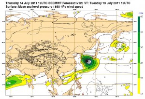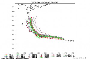 【台風1106号】日本予想は四国沖 欧米勢予想は九州接近(11/07/15)