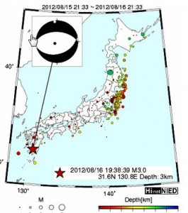平成24年08月16日19時43分 気象庁発表 16日19時38分頃地震がありました。 震源地は鹿児島県大隅地方 ( 北緯31.6度、東経130.8度)で震源の 深さはごく浅い、地震の規模(マグニチュード)は3.0と推定されます。 各地の震度は次の通りです。 なお、*印は気象庁以外の震度観測点についての情報です。 鹿児島県 震度2 霧島市福山町牧之原* 震度1 霧島市隼人町内山田 霧島市国分中央* この地震による津波の心配はありません。 |