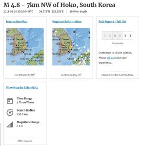 【#平昌オリンピック】韓国南部でM4.8(18/2/11)