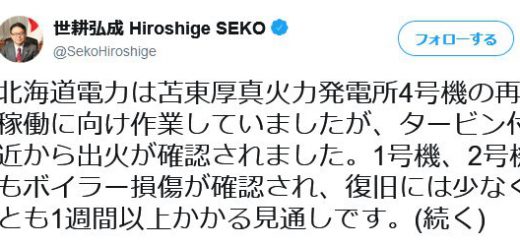 - 【#北海道地震】世耕経産相「苫東厚真火力発電所の全面復旧は11月以降」 【2018年09月11日(火)】