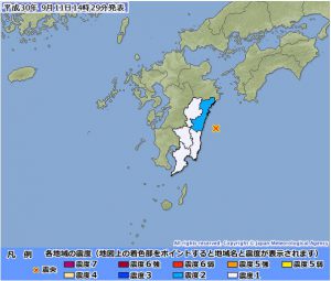 【#地震】宮崎 清武 地震キター:震源 日向灘(18/9/11)