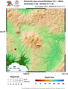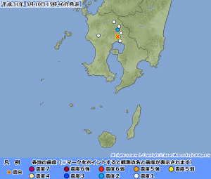 震源・震度に関する情報 平成31年 3月10日15時46分 気象庁発表 10日15時43分ころ、地震がありました。 震源地は、鹿児島県薩摩地方(北緯31.8度、東経130.7度)で、震源の深さは約10km、地震の規模(マグニチュード)は2.7と推定されます。 この地震による津波の心配はありません。 この地震により観測された最大震度は2です。 [震度3以上が観測された地域(鹿児島県(奄美地方除く))] 震度3以上が観測された地域はありません。 [震度1以上が観測された市町村(鹿児島県(奄美地方除く))] 鹿児島県 震度2 霧島市 震度1 薩摩川内市 伊佐市 湧水町 |