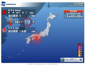 【#緊急地震速報】紀伊水道 M5.4 深さ40km(19/3/13)
