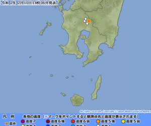 【#霧島山】霧島のマグマだまり直上付近震源の有感地震(20/2/10)
