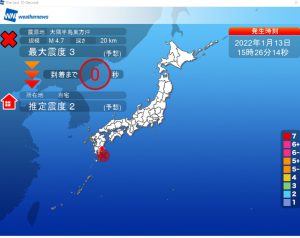 【#緊急地震速報】宮崎市:なんかユラユラ揺れたぁ~~(22/1/13)