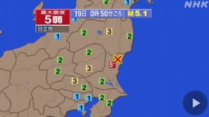 19日午前1時前、茨城県北部を震源とした地震が立て続けに発生し、このうち午前0時50分には日立市で震度5弱の揺れを観測しました。 |