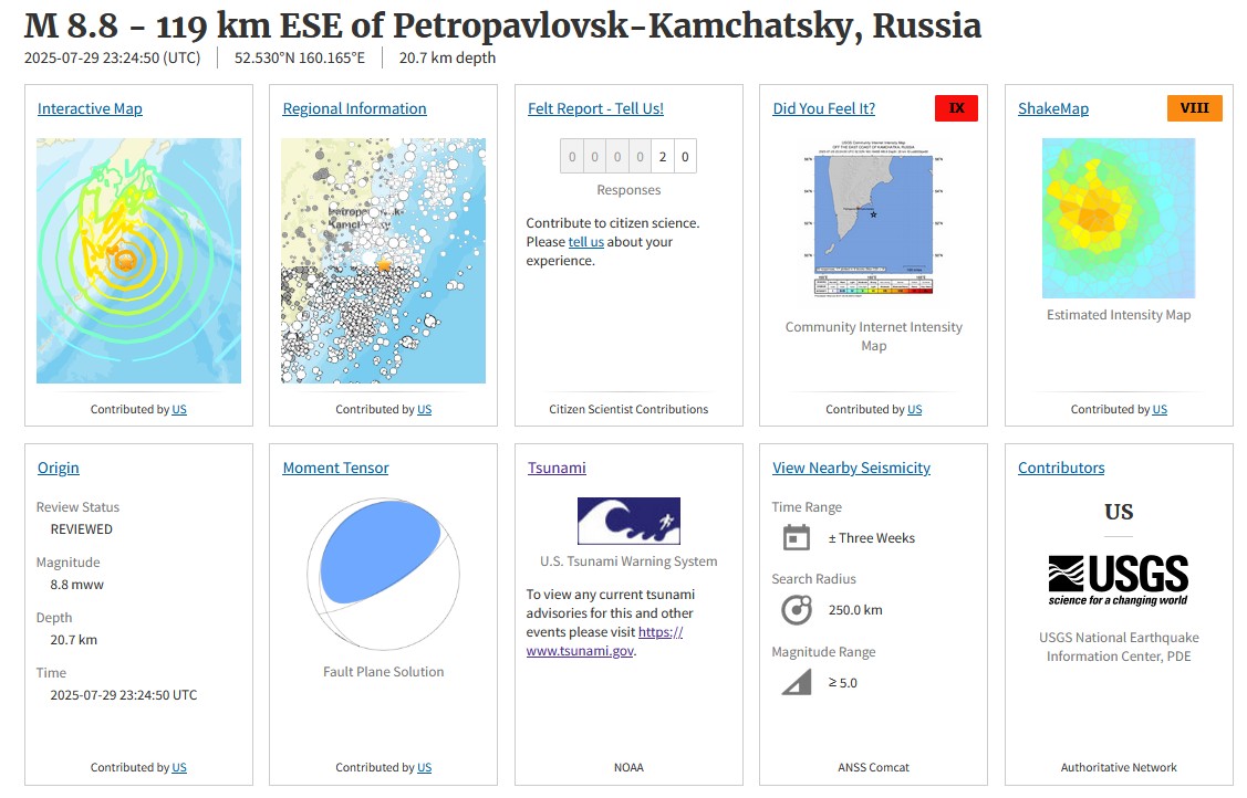 【巨大地震】カムチャッカ半島地震:マグニチュードが再修正 M8.8 深さ20km(25/7/30)