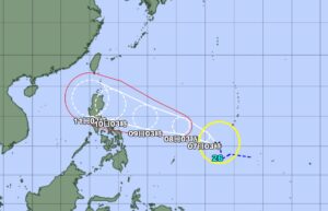 当面は西方向へ進む予想.が,台湾あたりで弱まりながら北上してくる予想もあるの