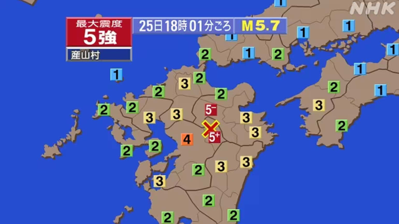 【地震】熊本で震度5強 大分で震度5弱 津波の心配なし(25/11/25)