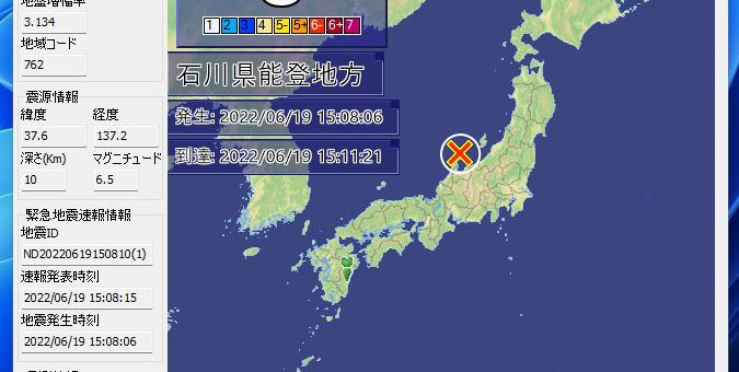 0 地震火山 / 普通のニュース 2022/6/20 月曜日 by くまさん · Published 2022/6/20 月曜日 【#緊急地震速報】石川県能登地方でM5.0 震度5強で速報中(22/6/20) またかっ! 余震っていいのか?群発地震が続いているの