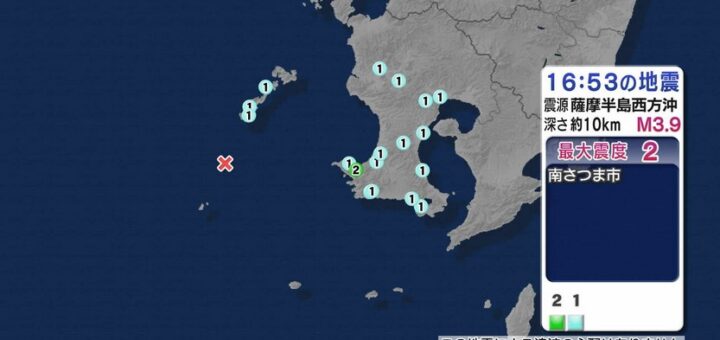 【#地震】薩摩半島西方沖で地震 南さつま市などで最大震度2 津波の心配なし(24/11/2)