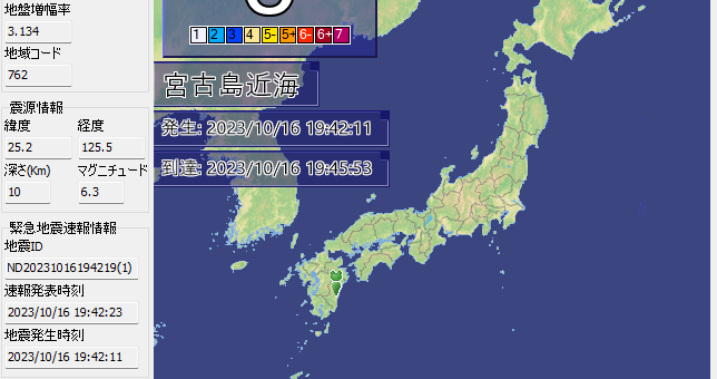 0 地震火山 / 普通のニュース 2023/10/16 月曜日 by くまさん · Published 2023/10/16 月曜日 【#緊急地震速報】宮古島付近 M6.3 NHKも速報出た(23/10/16) 震度4らしい... あとは津波だなぁ