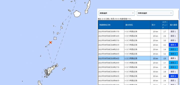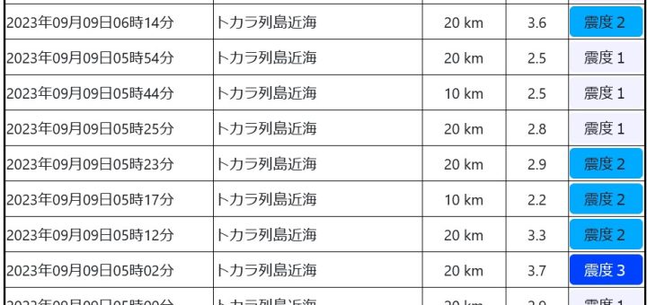0 地震火山 / 普通のニュース 2023/9/8 金曜日 by くまさん · Published 2023/9/8 金曜日 【#地震】トカラ列島で群発地震 最大震度3(23/9/8) だいぶ荒ぶっているのぉ すごい勢いで地震速報が流れてくるべ>トカラ