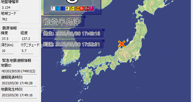 0 地震火山 / 普通のニュース 2023/5/30 火曜日 by くまさん · Published 2023/5/30 火曜日 【#緊急地震速報】石川:能登半島で地震 M5.7で速報中(23/5/30) 震度4言うてる 能登半島も地震が続くのぉ