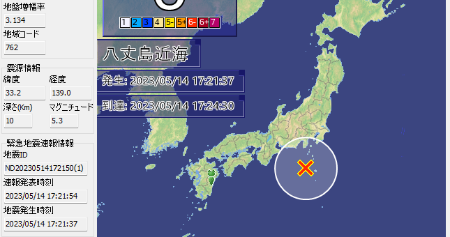 0 地震火山 / 普通のニュース 2023/5/14 日曜日 by くまさん · Published 2023/5/14 日曜日 【#緊急地震速報】八丈島近海で緊急地震速報乱発中(23/5/14) また,緊急地震速報が発報した 八丈島近海じゃげ