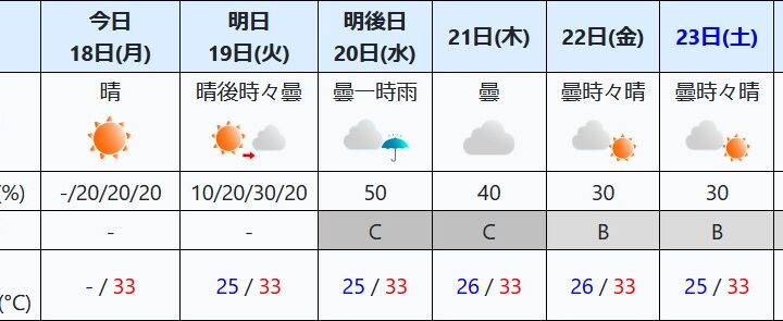 0 気象 2025/8/18 月曜日 by くまさん · Published 2025/8/18 月曜日 今週中頃,少し天気が悪くなるべ.日中涼しくはならないか? 南の海から,雲塊が北上してくる予想が出ているの 台風まではいかない感じじゃが 少し天気が悪くなるべ 朝は少し涼しくなってきたけど