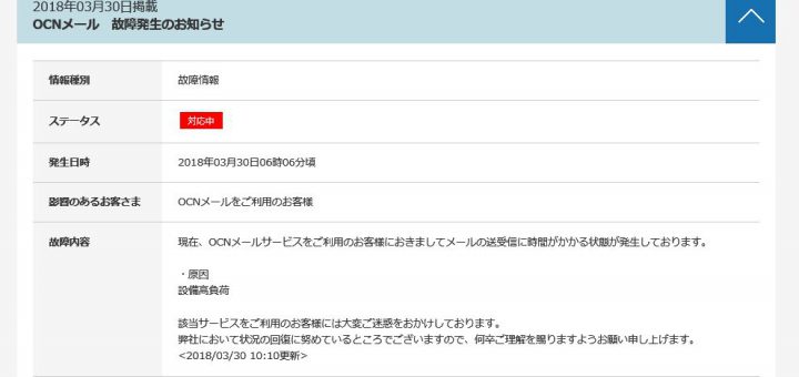 0 PC / 仕事関係のニュース 2018/3/30 金曜日 by くまさん · Published 2018/3/30 金曜日 OCNのメールがぶっ壊れた! お客さんからあさイチで架電 「メールが使えんとよー」