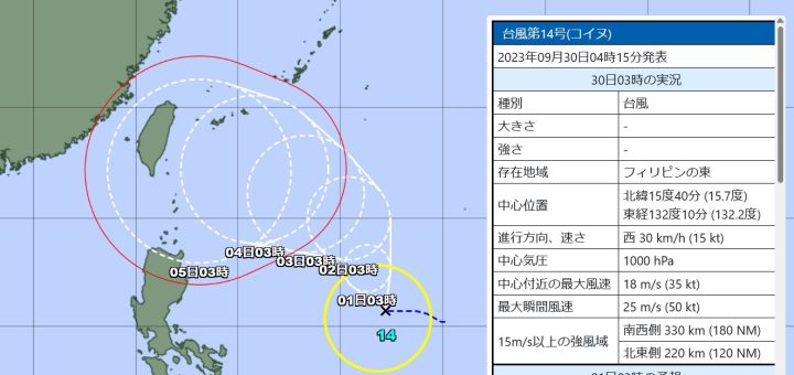 0 普通のニュース / 気象 2023/9/30 土曜日 by くまさん · Published 2023/9/30 土曜日 【#台風】台風14号(コイヌ)発生(23/9/30) イッヌ!台風発生ジャげ 西方向へ向かう予想