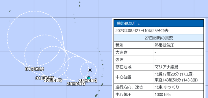 0 普通のニュース / 気象 2023/8/27 日曜日 by くまさん · Published 2023/8/27 日曜日 【#台風】熱帯低気圧Cが発生.台風化して九州四国方面へ?(23/8/27) 今週末の天気に大きな影響を与えそうな 熱低が爆誕