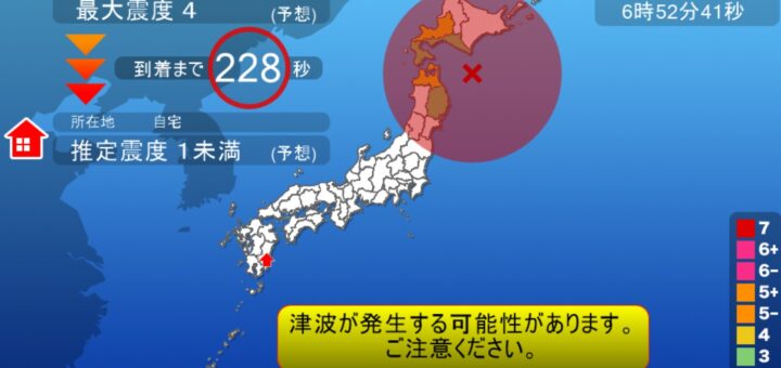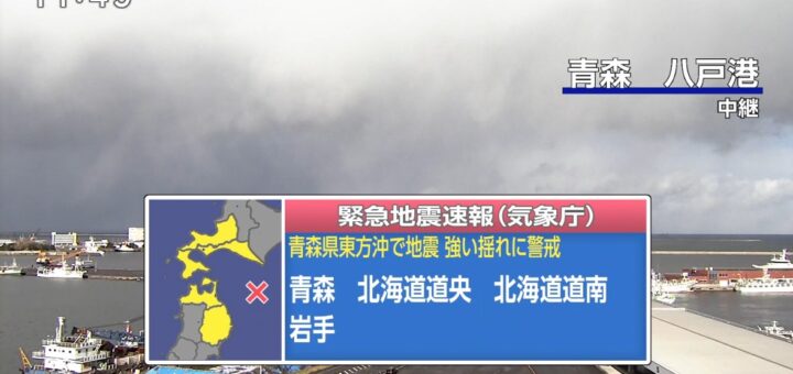 【地震】緊急地震速報:青森東方沖 M6.7 震度4で速報中(25/12/12)