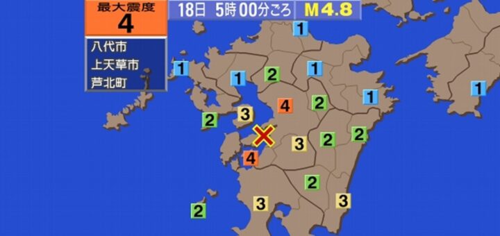 【地震】熊本県八代 上天草 芦北町で震度4 津波の心配なし (25/3/18)