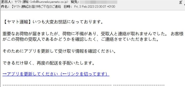 0 仕事関係のニュース 2023/2/4 土曜日 by くまさん · Published 2023/2/4 土曜日 【詐欺メール】クロネコさんを詐称した詐欺メールキタ━(゚∀゚)━!! クロネコの宅急便から 不在で荷物を持ち帰ったなメール