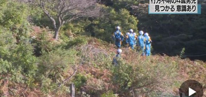 0 普通のニュース 2017/10/9 月曜日 by くまさん · Published 2017/10/9 月曜日 静岡 伊東の別荘地で不明の4歳男児発見 お,怪我なく見つかったかっ! 見知らぬ土地で迷子になったんじゃろなぁ