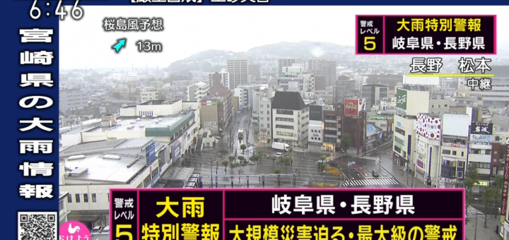 0 普通のニュース / 気象 2020/7/8 水曜日 by くまさん · Published 2020/7/8 水曜日 【#特別警報】岐阜県 長野県に大雨特別警報 発令(20/7/8) あらら,長野にも特別警報 特別警報,すごい勢いで発令中