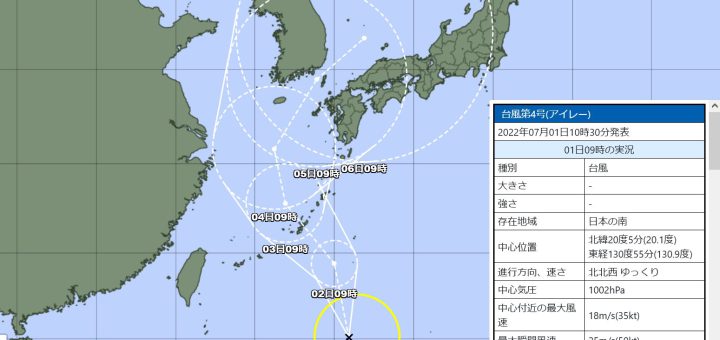 2 普通のニュース / 気象 2022/7/1 金曜日 by くまさん · Published 2022/7/1 金曜日 【#台風】台風4号[アイレー]発生(22/7/1) 9時に発生 日本列島に向けて北上予想じゃげな