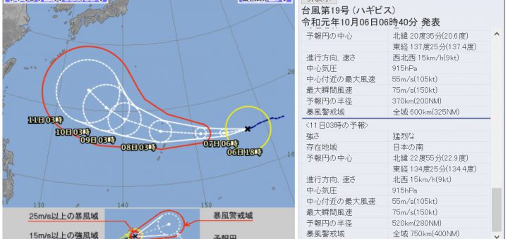 0 普通のニュース / 気象 2019/10/7 月曜日 by くまさん · Published 2019/10/7 月曜日 【#台風】大型で猛烈な台風19号:現在915hPa 900hPaへ発達予想(19/10/7) いやいや,900どころか 880hPaまで行きそうじゃじ