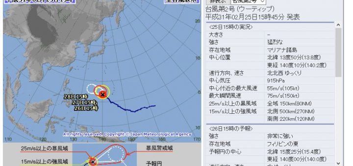 0 普通のニュース / 気象 2019/2/25 月曜日 by くまさん · Published 2019/2/25 月曜日 【#台風】台風2号:915hPaの猛烈台風へ再発達(19/2/25) 915hPaの最大風速55メートルとか出てるぞ~ 今は9月かよっ!カ...