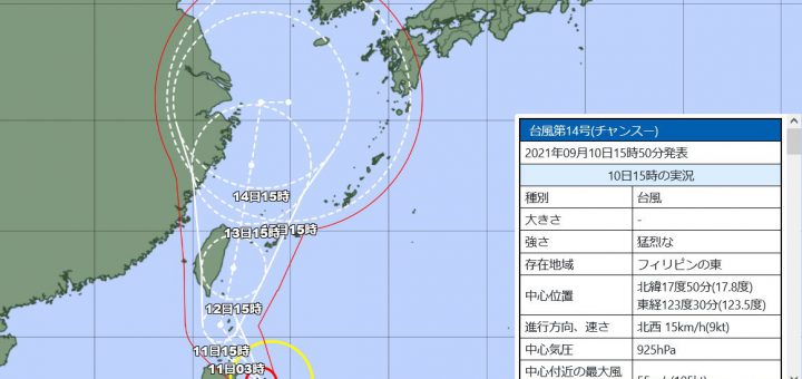 4 普通のニュース / 気象 2021/9/10 金曜日 by くまさん · Published 2021/9/10 金曜日 【#台風】台風14号 CI値7.3 911hPa 米軍も直角に曲げるし九州に向かうのかヤバス(21/9/10) 911ヘクトパスカルの解析 さらに発達中 米軍はカテゴリ5に再昇格