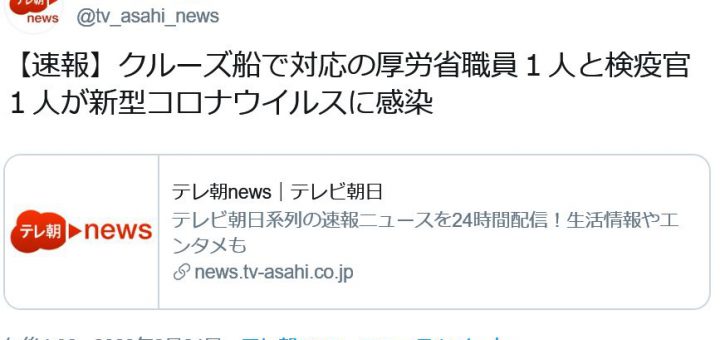 0 普通のニュース 2020/2/24 月曜日 by くまさん · Published 2020/2/24 月曜日 【#新型コロナウイルス】クルーズ船で対応の厚労省職員1人と検疫官1人(20/2/24) もう厚労省は完全に省内パンデミックになってそう こうなると,クルーズ...