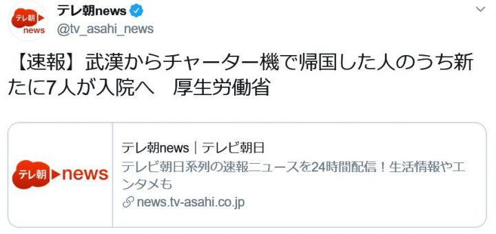 0 普通のニュース 2020/1/29 水曜日 by くまさん · Published 2020/1/29 水曜日 【#新型肺炎 2019-nCoV】武漢からチャーター機で帰国した人のうち新たに7人が入院へ(20/1/29) なんとっ! 入院した5人(そのうち二人に肺炎の兆候があったみたいじゃ...