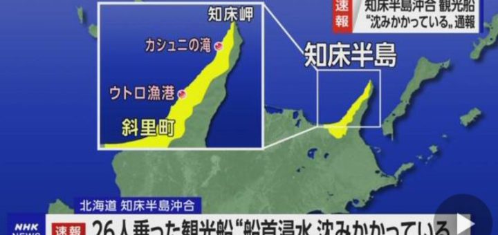 0 普通のニュース 2022/4/24 日曜日 by くまさん · Published 2022/4/24 日曜日 26人乗った観光船が不明 捜索続く 北海道 知床半島沖 今速報で,人のようなものが見つかった,って言うてる 人って断定できて...