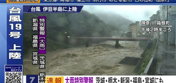 0 普通のニュース / 気象 2019/10/12 土曜日 by くまさん · Published 2019/10/12 土曜日 【#台風 #特別警報】#台風19号:大雨特別警報発令(19/10/12) 静岡,神奈川,東京,埼玉,群馬,山梨,長野に発令 範囲広すぎヤバス