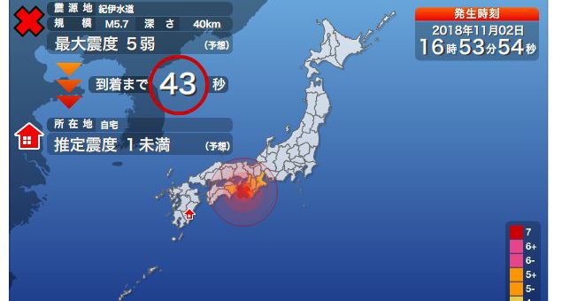 2 地震火山 2018/11/2 金曜日 by くまさん · Published 2018/11/2 金曜日 【#緊急地震速報】紀伊水道でM5.7 震度5弱の速報(18/11/2) おっと,紀伊水道で地震 M5.7 5弱言うてる