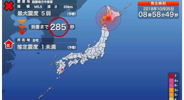 2 地震火山 / 普通のニュース 2018/10/5 金曜日 by くまさん · Published 2018/10/5 金曜日 【#緊急地震速報】北海道胆振地方でM5.5 震度5弱(18/10/5) おっと,デッカイ余震が今頃来やがった M5.5で震度5弱にて緊急地震...