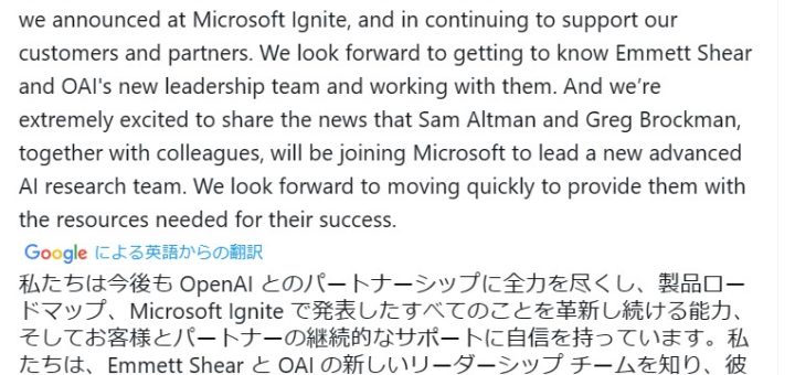 0 仕事関係のニュース 2023/11/19 日曜日 by くまさん · Published 2023/11/19 日曜日 【#ChatGPT】アルトマン氏の復職、マイクロソフト含むオープンAI株主が要求 今回の内紛解任劇,マイクロソフトが激オコだそうで 社員も辞めてアルトマンさんに付いていく,言い出してるそうで